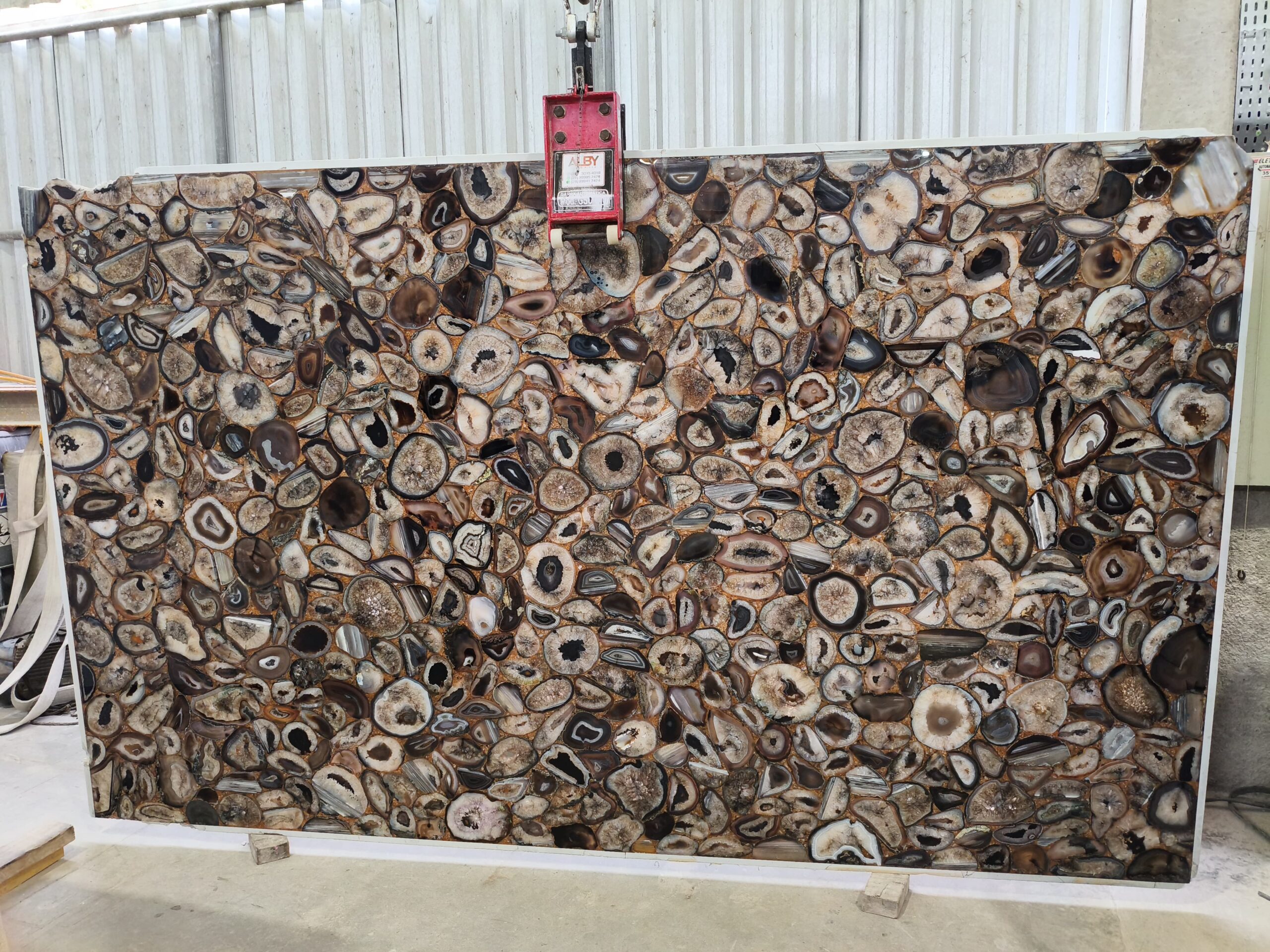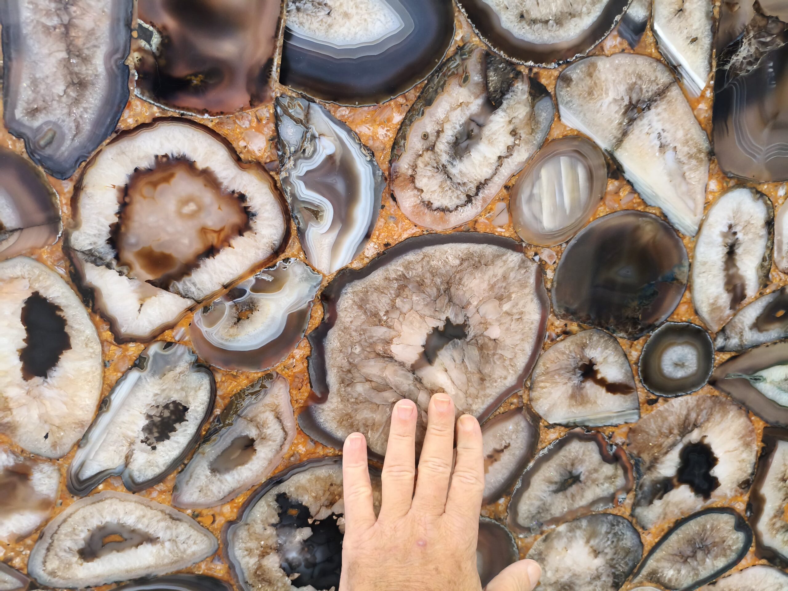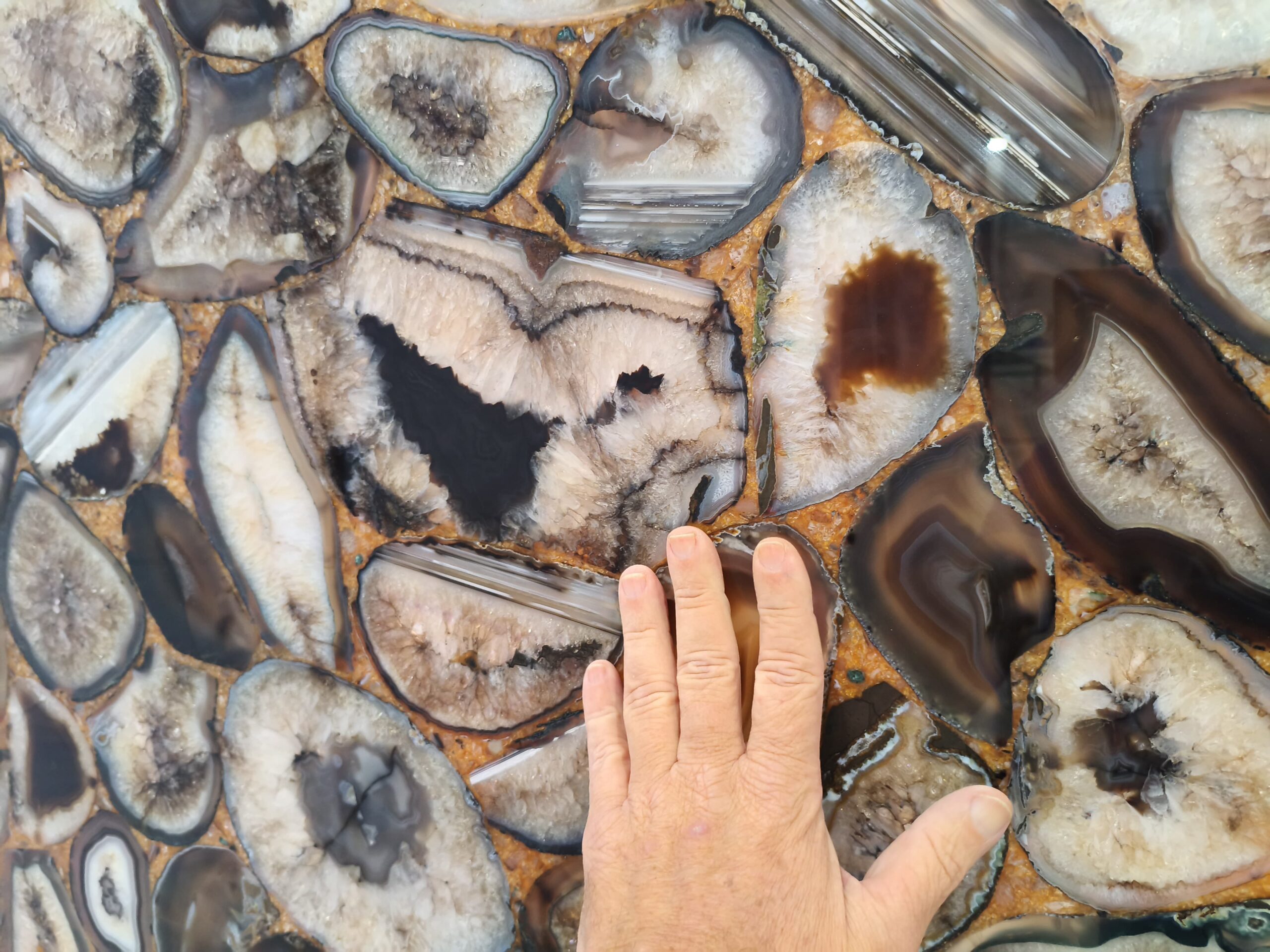 O Mosaico de Ágata Preta com veios dourados é uma peça sofisticada e exclusiva, composta por fragmentos naturais de ágata cuidadosamente selecionados e polidos. Com seus tons vibrantes de preta, que variam do claro translúcido ao profundo e intenso, este mosaico confere um toque de luxo e elegância a qualquer ambiente. Ideal para revestimentos, painéis, pisos e bancadas decorativas ou detalhes arquitetônicos, ele combina beleza orgânica com acabamento refinado, sendo perfeito para projetos de alto padrão que valorizam a natureza e o design.